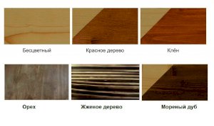 Цвета на выбор: бесцветный, клён, орех,  красное дерево, морёный дуб, жженое дерево.