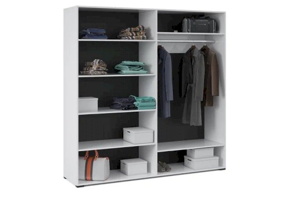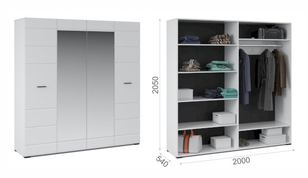 Распашной 4х дверный шкаф для одежды Йорк выполнен в современном стиле, сочетает в себе функциональность и эффектный внешний вид: строгая горизонтальная фрезеровка фасадов, контрастного черного цвета ручки и задняя стенка из ХДФ, элегантный белый цвет. Блеск глянцевых фасадов High Gloss из МДФ и зеркала наполняют комнату светом, делают ее просторнее. Внутри предусмотрены вместительные секции для белья и отделение со штангой. Мебель выполнена из экологически безопасных и надежных материалов.