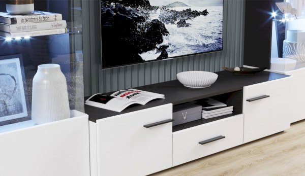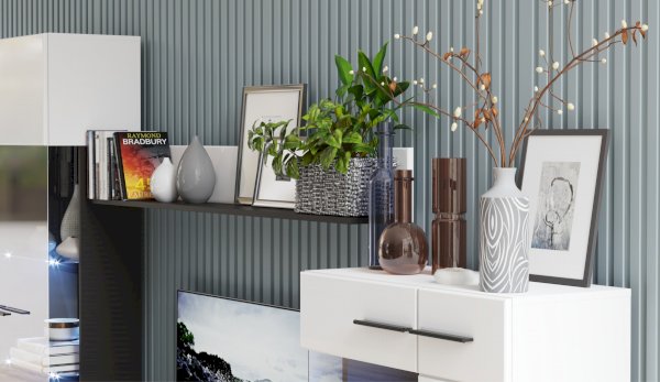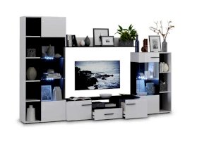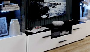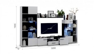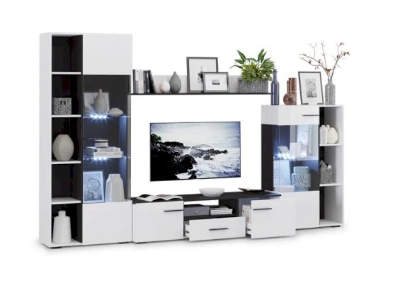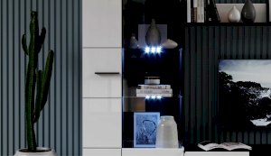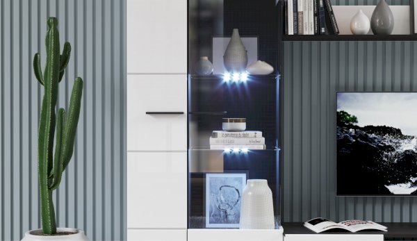 Современная стенка Невада – яркий представитель стиля минимализма, отличается высокой функциональностью и эстетичным внешним видом. Глянцевые белые фасады из МДФ и прозрачные витрины из закаленного стекла создают легкость и воздушность, а эффект блеска и отражения зрительно увеличивает пространство комнаты, добавляет света. Комбинированный контрастный корпус, ручки и задняя стенка черного цвета подчеркивают строгую геометрию линий и форм. Светодиодная подсветка делает акцент на дорогих для Вас вещах, таких как фото, статуэтки или посуда. Мебель выполнена из экологически безопасных и надежных материалов.