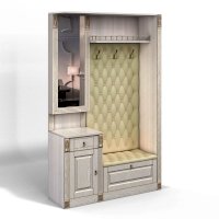 Прихожая выполнена в классическом стиле с декоративными элементами. Фасады и декоративные элементы патинированы, патина наносится вручную, по классической итальянской технологии и защищена матовым лаком. Мягкие элементы (вешалка и сиденье) выполнены из экокожи, декорированы каретной стяжкой.