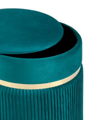 Лаконичная модель пуфа в обивке из мягкого велюра, которая дополнит интерьер вашего дома. Обивка красиво украшена декоративными оборками и металлическим ободком в золотом цвете. Под сиденьем имеется ящик для хранения различных мелочей. В основании предусмотрены специальные подпятники, которые делают пуф более устойчивым и предотвращают скольжение.