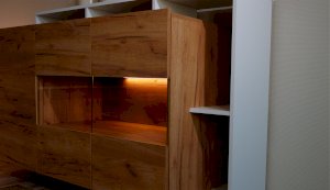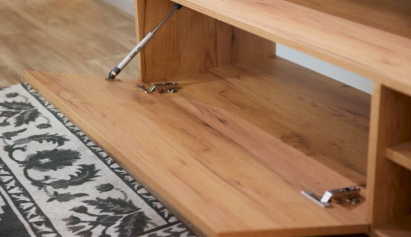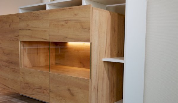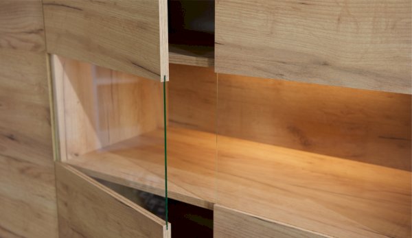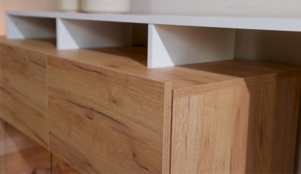 Стенка Невио-2 выполнена с использованием новейшего декора «Дуб крафт золотой» в сочетании с белым - подходит для стилистических направлений лофт, минимализм, скандинавский. Простые формы, естественные природные оттенки создают гармоничную и умиротворенную атмосферу гостиной. Четкая текстура дерева, белый цвет, отсутствие внешней фурнитуры, углубленный цоколь - создают визуальную легкость и компактность стенки. Фасады, выступающие на 1см поверх корпуса, заменяют ручки. Стенку дополняет вместительный комод с витриной. Мебель выполнена из высококачественных экологичных материалов.