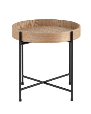 Лаконичный журнальный столик Стар. Круглая столешница выполнена из МДФ и покрыта шпоном из ясеня. Высокие бортики по краям предотвращают падение предметов со столика и добавляют удобства при использовании. Металлический каркас в черном цвете выдерживает нагрузку до 50 кг. Столик станет практичным дополнением интерьера спальни или прихожей.