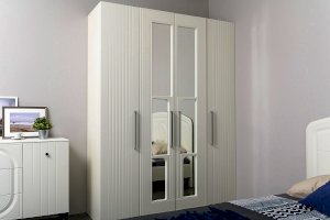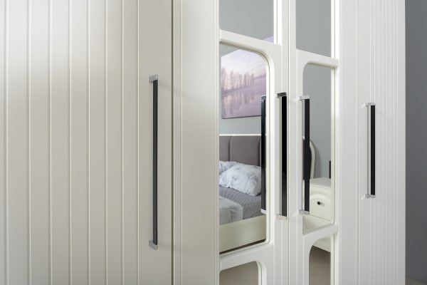 Нестандартно и интересно решён декор двустворчатого шкафа. Зеркало накладывается изнутри фасада, проявляя таким образом сквозную ажурную фрезеровку.