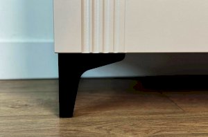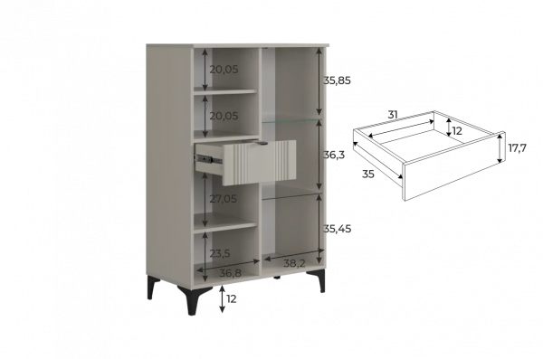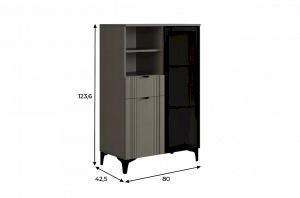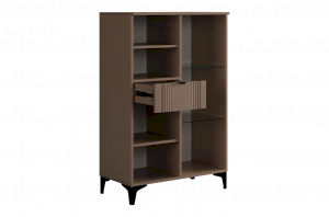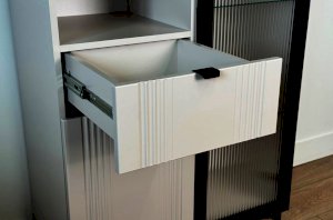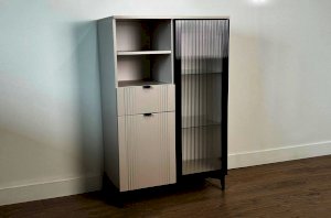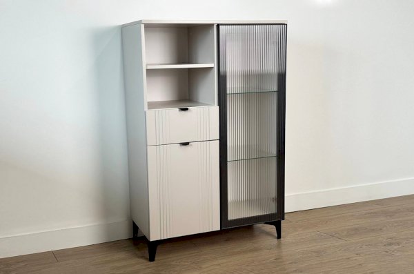 Дизайн комода продуман до мелочей: с одной стороны расположена стеклянная дверца, за которой находится просторное пространство для хранения. С другой стороны – ниша с открытой полкой, выкатной ящик и ещё одна глухая дверца, что позволяет гибко организовать хранение и поддерживать порядок в доме.