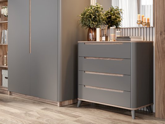 В этой спальне воплощены лучшие черты современного европейского дизайна! Теплой и уютной делает спальню сочетание двух текстур: древесная и матовый белый или оникс серый. Округлые, мягкие линии мебели создадут атмосферу покоя в спальне, а отсутствие острых углов обеспечат безопасность. Шкафы собираются по принципу бесконечного шкафа - это мебельный конструктор, из которого можно собрать свой шкаф мечты, где для каждой вещи найдется свое место.